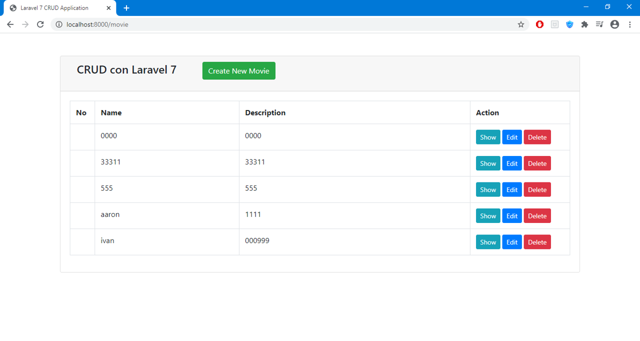 Navegador: x|-|D --------------------------------------------------- http://localhost:8000/movies ---------------------------------------------------Resultado final