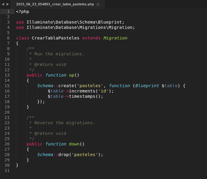Pero, ¿si quisiera eliminar la tabla con la función down de la migración crear_tabla_pasteles?
