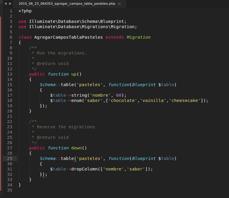 En el dado caso que necesitaramos agregar más campos a la tabla pasteles, podríamos simplemente ir a la migración crear_tabla_pasteles y en la función up poner la nueva columna, pero con esto perderiamos la primer versión de la tabla, entonces para poder ejeplificar como se agregan columnas con las migraciones crearemos una nueva que se llame agregar_campos_tabla_pasteles con los comandos que ya hemos visto: